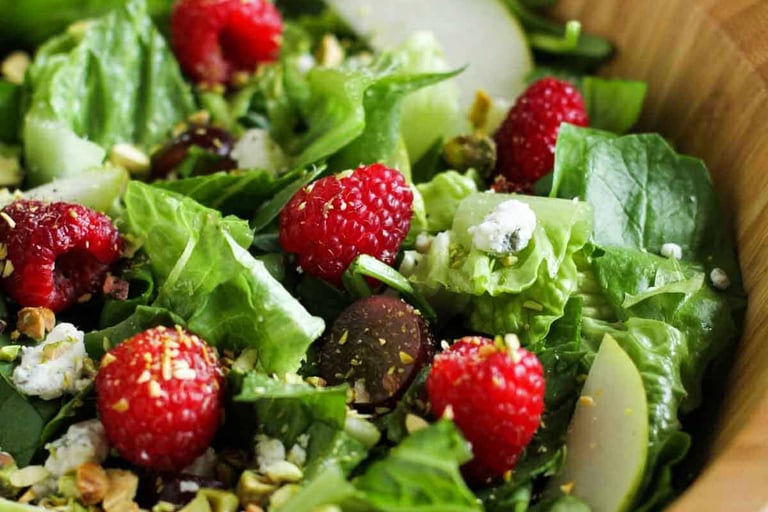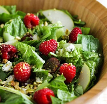 Add spinach, berries, avocado, and walnuts to a bowl.